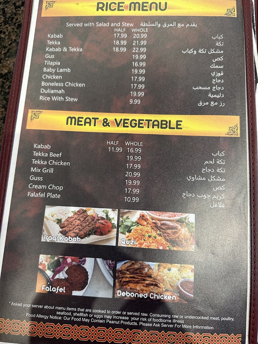 كباب دجاج وكباب لحم گص لحم ودجاج دجاج كريم چاپ و دجاج تيكا يقدم مع الرز والسلطة والمرق 1 meat kabab 1, 1 chicken kabab, guss meat & chicken, chicken tekka, chicken, cream chop, served with rice, salad and stew.